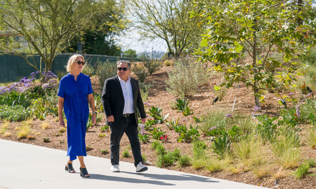 City of Hope Orange County President Annette M. Walker and landscape designer Jerico Farfan stroll through the Julia and George Argyros Garden of Hope.