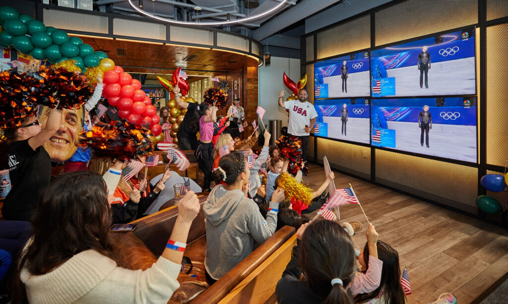 Fans cheer on local heroes during a watch party at Great Park Ice for the Olympic skating events.