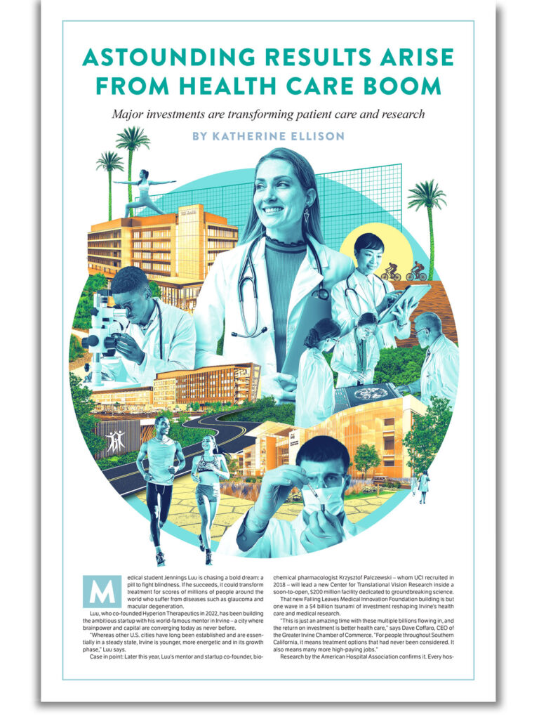 “This is just an amazing time with these multiple billions flowing in, and the return on investment is better health care,” says Dave Coffaro, CEO of the Greater Irvine Chamber of Commerce. “For people throughout Southern California, it means treatment options that had never been considered. It also means many more high-paying jobs.”