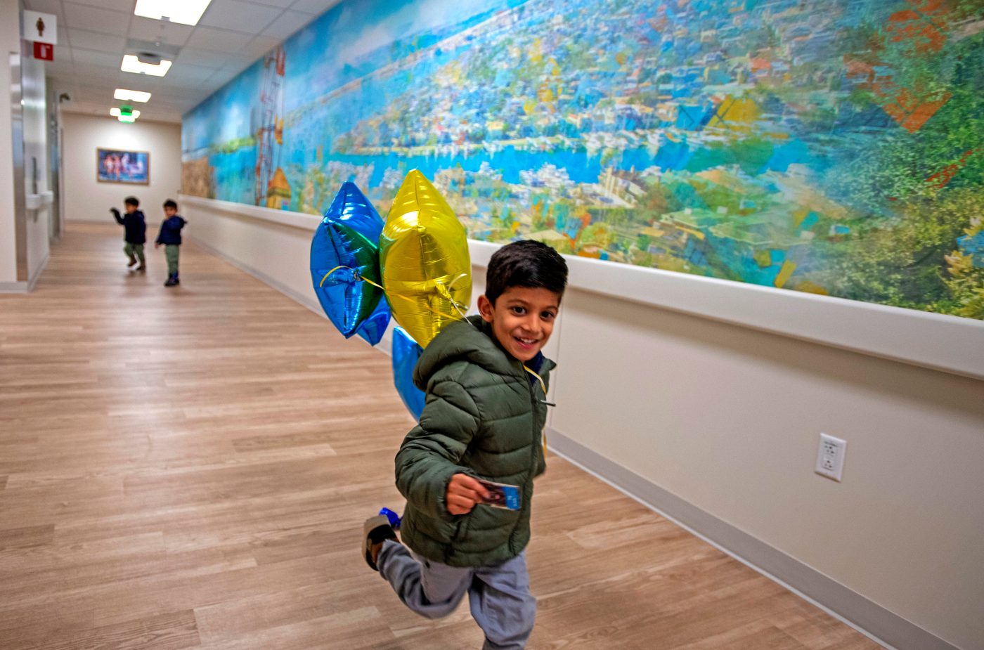 Arjun Padua, 4, runs along a freshly painted mural during the opening of its new Irvine health center on Saturday, Nov. 15, 2025. Called the first all-electric hospital in the United States, the building is designed to lower carbon emissions by moving away from natural gas. The event featured tours of the 144-bed facility, a yoga class, food trucks and face painters. on Nov. 15, 2025. (Photo by Michael Goulding, Contributing Photographer)