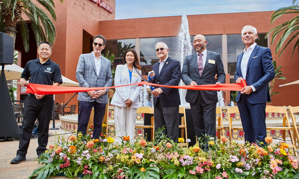 Dignitaries cut the ribbon at The Market Place: council member William Go; Dave Coffaro, CEO of Greater Irvine Chamber; council member Melinda Liu; Mayor Larry Agran; Vice Mayor and council member James Mai; Ken Gillett, President of Irvine Company Retail Properties.